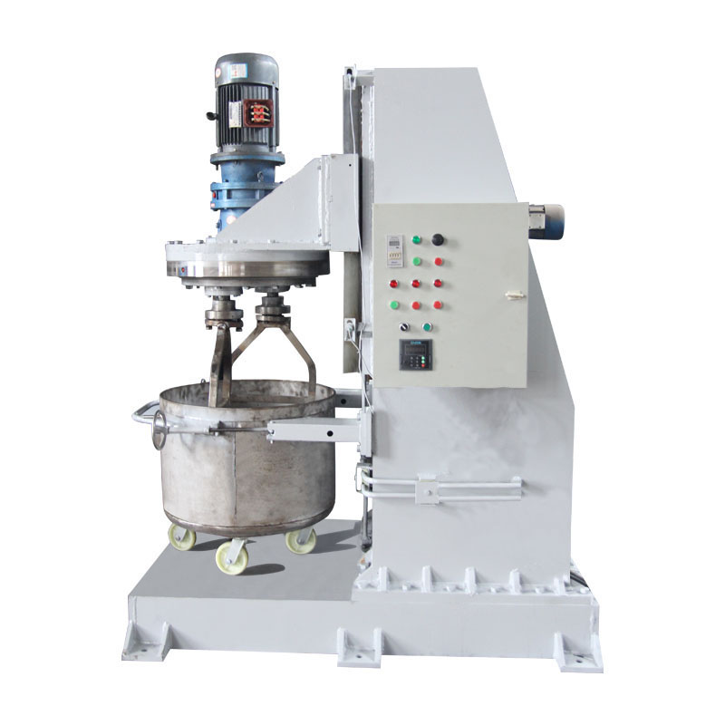3、料筒:物料在不銹鋼材質(zhì)的料筒內(nèi)進行攪拌。料筒裝在升降平臺上,通過油缸實現(xiàn)升降。料筒下部裝有滾輪,可以推進。拉出。當(dāng)攪拌器旋轉(zhuǎn)時,料筒由擺線針輪減速機通過凸輪和滾輪帶動同時旋轉(zhuǎn),旋轉(zhuǎn)方向可以選擇??刂泼姘迳涎b有變頻調(diào)節(jié)旋鈕,可以根據(jù)工藝要求調(diào)節(jié)旋轉(zhuǎn)速度。